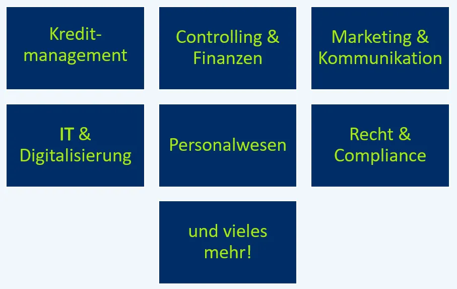 Unsere internen Abteilungen bieten Ihnen vielfältige Möglichkeiten, Ihre Karriere zu starten oder neu auszurichten - sei es in den Bereichen Kreditmanagement, IT, Marketing, Personal oder vielen mehr.